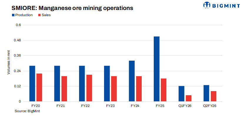 • Sandur Manganese and Iron Ores (SMIORE) lifted manganese ore production by 6% q-o-q to 128,000 t in Q2FY’26. Meanwhile, sales surged 65% q-o-q.