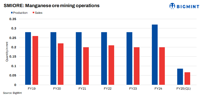 Sandur Manganese and Iron Ores (SMIORE) recorded manganese ore production at 85,000 t in Q1FY’25, up by 18% from Q1FY’24. Sales of the same rose by 86% y-o-y. Ferro alloys production stood at 6,464 t, down by 21% y-o-y in Q1FY’25 as against 8,196 t in Q1FY’24. However, sales of ferro alloys increased by 35% to 9,396 t y-o-y in Q1FY’25 which was 6,937 t in Q1FY’24.
