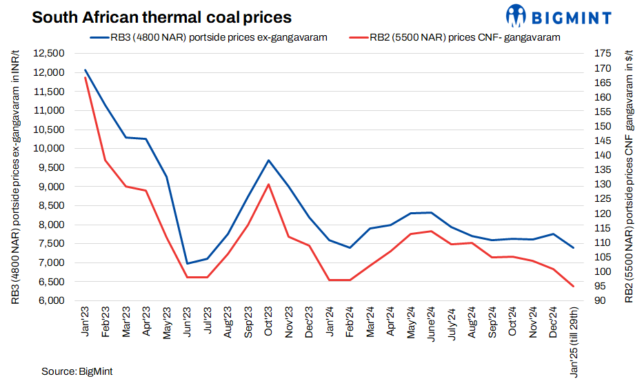 Portside South African thermal coal prices in India declined this week due to weak demand and selling pressure on suppliers. RB2 (5500 NAR) coal prices dropped by INR 100/t to INR 8,700/t, while RB3 (4800 NAR) fell by INR 50/t to INR 7,250/t at Gangavaram Port. The decline in South African coal export prices has contributed to the downward trend in prices.