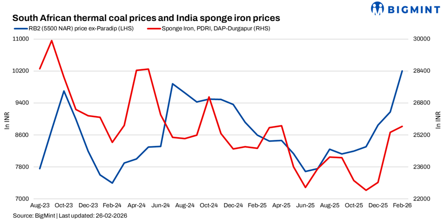 Sponge iron P-DRI DAP Durgapur rose by INR 100/t w-o-w to INR 25,100/t. However, the broader sponge iron market remained weak. On 25 February, prices declined by INR 50-500/t d-o-d across major regions due to sluggish finished steel demand. Buyers restricted purchases to immediate needs, anticipating further corrections. Producers trimmed spot offers despite firm raw material costs, but lower prices failed to revive liquidity. Market participants reported minimal enquiries and absence of bulk deals, reflecting subdued confidence across the steel value chain.