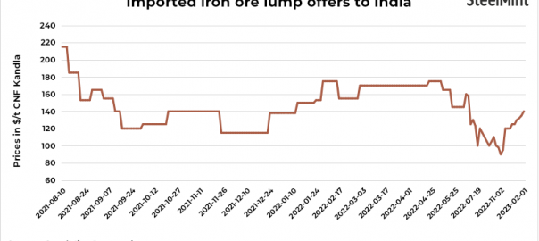 South African iron ore lump import offers improved by $5/t CNF Kandla w-o-w compared to the last assessment on 25 Jan’23. The assessment for lump (Fe64%) stands at $140/t CNF Kandla on 1 Feb’23. Benchmark global iron ore fines (Fe 62%) prices increased by $2.15/t, w-o-w to $128.95/t CNF China on 31 Jan’23. The spot iron ore lump premium rose by $0.022/t to $0.1370/dmtu w-o-w on 31 Jan.