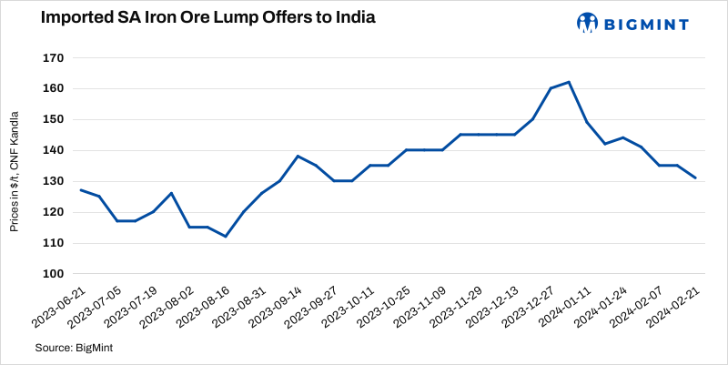 South African iron ore lump (Fe 64%) import offers fell by $4/t w-o-w to $131/t CNF Kandla on 21 Feb’24 following the sharp drop in spot and futures prices in China. No inquiries from Indian buyers amid iron ore and pellet prices drop in the domestic market. The benchmark Fe 62% fines index decreased by $7/t d-o-d to $122/t CFR China on 20 Feb post-holidays.