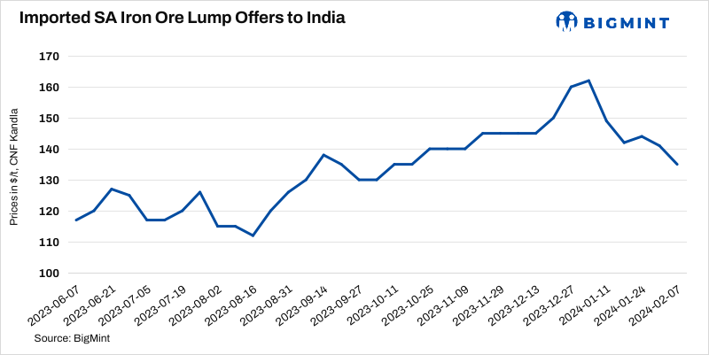 South African iron ore lump (Fe 64%) import offers fell by $6/t w-o-w to $135/t CNF Kandla on 7 Feb’24 following sluggish market sentiments in China. Indian buyers were expecting more $15/t drop in prices to import the lumps from South Africa. The benchmark Fe 62% fines index decreased by $9/t w-o-w to $126/t CFR China on 6 Feb amid the Lunar holidays.