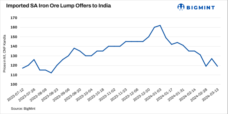 South African iron ore lump (Fe 64%) imported offers declined by $8/t w-o-w to $119/t CNF Kandla on 13 Mar’24 following the sharp drop in spot and futures prices in China. As per sources, buyers were observing the market, and after another $8-10/t reduction in prices may hedge the material for buying. The benchmark Fe 62% fines index decreased by $7/t w-o-w to $110/t CFR China yesterday.