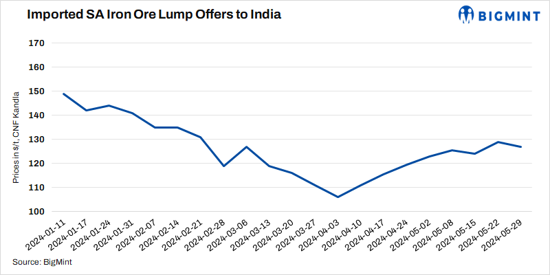 South African iron ore lump (Fe 64%) import offers decreased by $2/t w-o-w to 127/t CNF Kandla on 29 May’24 amid a drop in iron ore futures and global market sentiments. No inquiries from India were heard and prices of domestic lumps and pellets are quite competitive. The benchmark Fe 62% fines index dipped $3/t w-o-w to $118/t CFR China on 28 May.