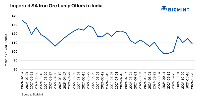 Indian import offers for South African iron ore lumps (Fe 64%) dropped by $5/t w-o-w to $109/t CNF Kandla on 23 Oct’24. Demand for imported lumps remained low due to the absence of international traders for the India-South Africa route and reduced buying interest from Gujarat-based mills. Spot prices of iron ore (Fe 62%) fines fell by $5/t w-o-w to $100/t CFR China on 22 Oct.