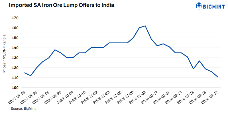 South African iron ore lump (Fe 64%) import offers dropped $5/t w-o-w to $111/t CNF Kandla on 27 Mar’24. As per sources, enquires from India remained slow amid the decline in pellet prices in western India. Iron ore (Fe 62%) fines spot prices fell by $4/t w-o-w to $104.20/t CFR China on 26 Mar due to weak demand for raw materials.