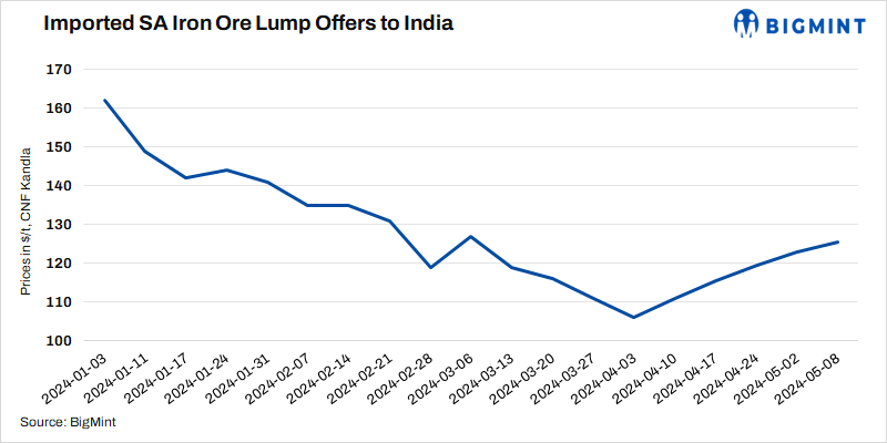 South African iron ore lump (Fe 64%) import offers increased by $2.5/t w-o-w to $125.5/t CNF Kandla on 8 May’24. Price rose amid surge in demand post Chinese holidays. However, sources stated that this offer may not be feasible for Indian buyers as domestic pellet offers in Kandla are cheaper. Benchmark Fe 62% fines index rose by $2/t w-o-w to $119/t CFR China on 7 May.
