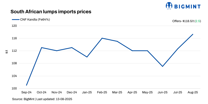 India’s import offers for South African iron ore lumps (Fe 64%) increased by $2.5/t w-o-w to $118.5/t CNF Kandla on 13 Aug’25. However, deals remained absent in the Kandla market. Active buying of imported pellets at competitive prices reduced demand for lumps, resulting in fewer inquiries. Chinese spot iron ore fines prices rose $2/t w-o-w to $104/t CFR on 12 Aug.