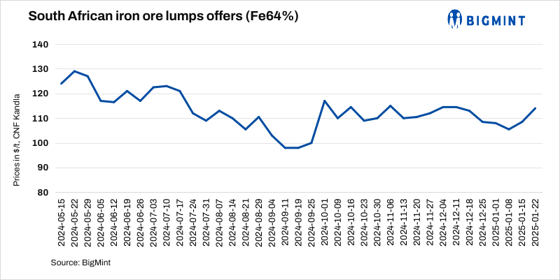 India’s import offers for South African iron ore lumps (Fe 64%) climbed up by $5.5/t w-o-w to $114/t CNF Kandla on 22 Jan’25 amid a rise in global fines and lump premium prices. However, inquiries were absent, following some active deals in Kandla for imported pellets from MENA regions. China’s seaborne spot prices of iron ore (Fe 62%) fines moved upward by $4/t w-o-w to $105/t CFR on 21 Jan.