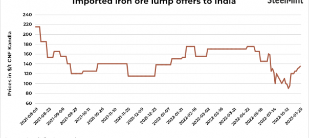 South African iron ore lumps (Fe64%) import offers increased by $3/t w-o-w to $135/t CNF Kandla today. Benchmark global iron ore fines (Fe 62%) prices stood at $126.65/t CNF China and spot iron ore lump premium was at $0.1150/dmtu, as on 20 Jan’23. The Chinese market will remain close for the next few days on account of the Lunar New Year holidays.