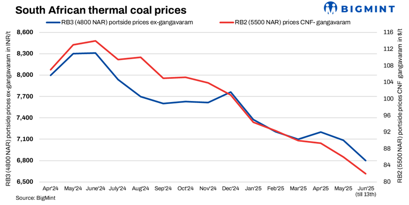 South African coal prices at Indian ports fell further this week on tepid buying, higher domestic availability, and freight pressure amid a crude oil price surge. RB2 (5500 NAR) dropped by INR 100/t w-o-w to INR 7,700/t exw-Gangavaram, while RB3 (4800 NAR) declined by INR 50/t to INR 6,800/t. At Vizag, RB2 and RB3 were assessed at INR 7,650/t and INR 6,650/t, respectively.