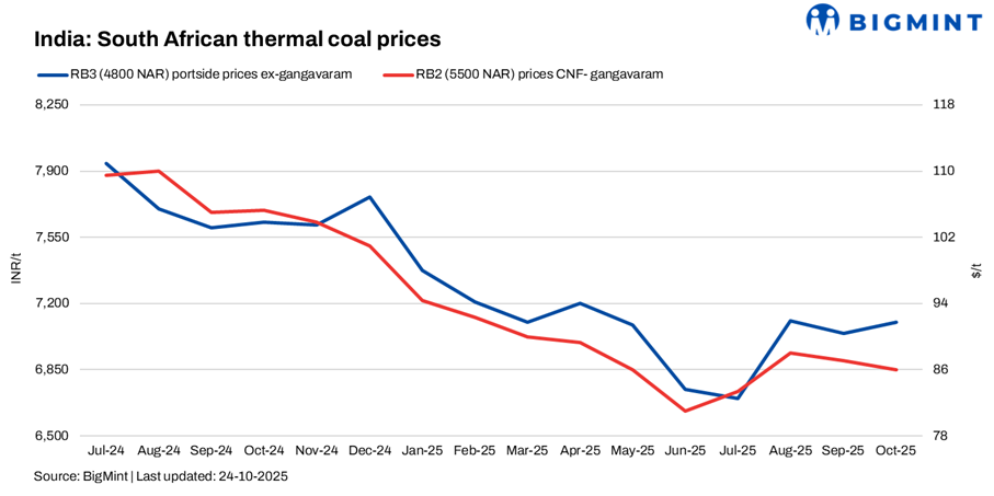 South African portside coal offers in India held steady w-o-w, with RB2 assessed at INR 8,200/t and RB3 at INR 7,100/t across Paradip, Vizag, and Gangavaram. Market activity was subdued, as the Diwali holidays slowed down trading, with most end-users having completed procurement ahead of the festive break. Two deals were heard from Dhamra — one for RB2 at INR 8,400/t and another for around 40,000 t at INR 8,700/t.