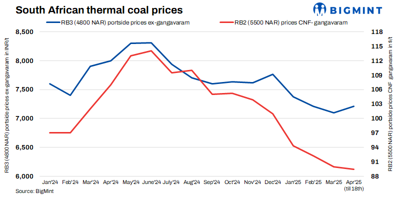 BigMint’s assessment of portside South African thermal coal prices in India showed a mixed trend this week. RB2 (5500 NAR) offers remained stable at INR 8,450/tonne (t) exw-Gangavaram, while RB3 (4800 NAR) also held steady at INR 7,200/t. However, slight softening was seen at other ports. At Paradip, RB2 dropped to INR 8,350/t and RB3 to INR 7,200/t. Exw-Vizag, RB2 was heard at INR 8,300/t and RB3 at INR 7,150/t.