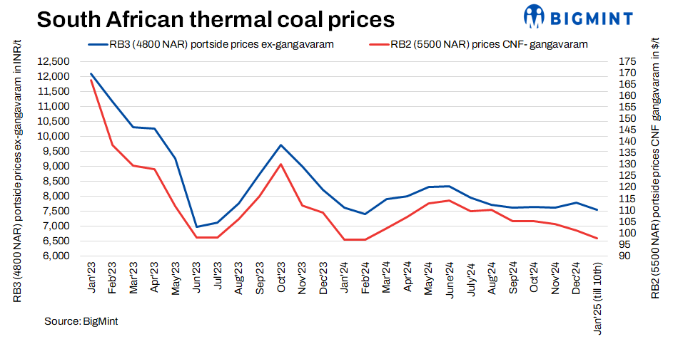 India’s portside prices of South African thermal coal dropped this week, reflecting reduced sponge iron prices and sufficient port inventories. RB2 (5500 NAR) prices slipped to INR 8,950/tonne (t), down by INR 300/t w-o-w (w-o-w), while RB3 (4800 NAR) prices fell to INR 7,300/t, a decrease of INR 350/t w-o-w, both ex-Gangavaram. Weak buying interest amid fallen sponge prices and abundant domestic supplies contributed to the lower price trend.