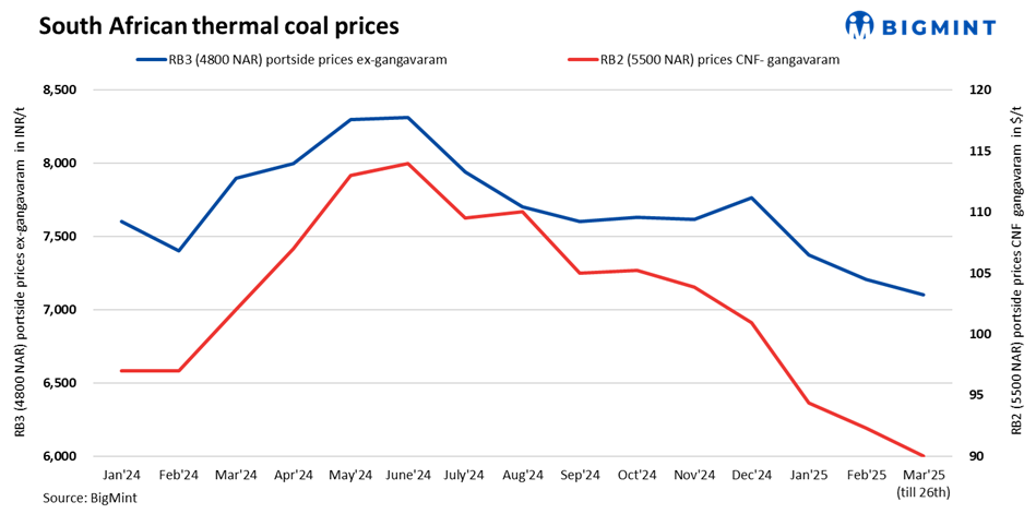 South African portside thermal coal prices remained largely unchanged w-o-w. RB2 (5500 NAR) continued to hover at around INR 8,450/t, while RB3 (4800 NAR) held steady at INR 7,100/t. Trade activity remained subdued amid falling domestic coal prices, and no major deals were observed, which kept overall market sentiment unchanged.