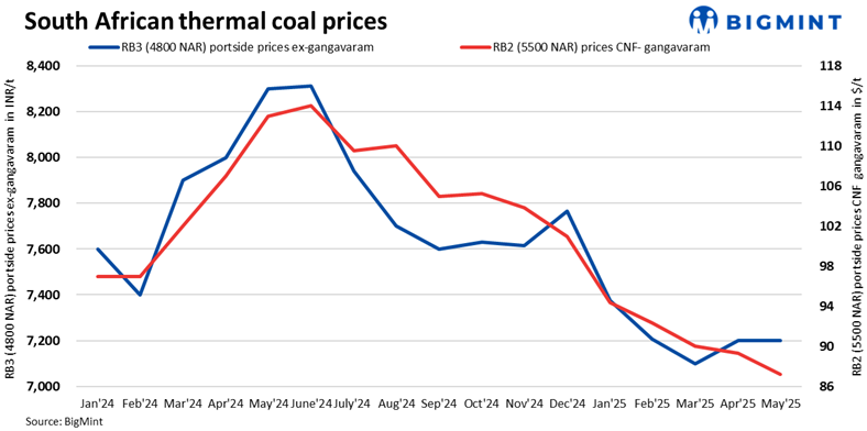 South African RB2 (5500 NAR) thermal coal prices at Paradip dropped by INR 300/t w-o-w to INR 7,950/t ex, around a 4-year low, last seen in May’21. Meanwhile, RB3 (4800 NAR) slipped by INR 200/t w-o-w to INR 6,950/t. Portside prices continued to decline this week, as sellers were under pressure to offload cargoes amid persistently dull demand.