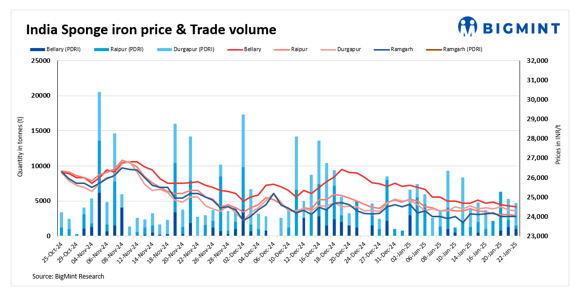 Deals for about 8,250 t of sponge iron were recorded today compared to 9,750 t on 21 January.