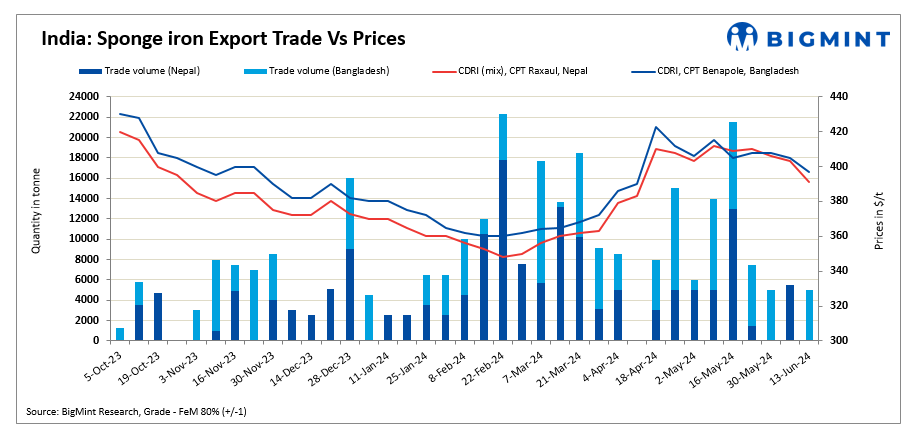 Sponge iron export offers saw a significant decline of $8-12/t w-o-w, driven by limited demand in the global spot market for sponge iron this week. Offers for Nepal dropped to $391/t CPT Raxaul due to weak demand, with no buying activity reported this week. Approximately 5,000 t of sponge iron were sold to Bangladesh at $396-$398/t CPT Benapole.
