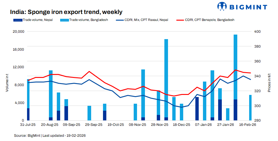India’s sponge iron export market remained under pressure this week, tracking the persistent downtrend in the domestic market. As per BigMint’s weekly assessment, offers to Nepal declined by $5/t to $335/t CPT Raxaul, while offers to Bangladesh eased by $1/t to $344/t CPT Benapole. Buying activity remained limited during the week, with approximately 5,500 t of sponge iron deals were concluded, destined for Bangladesh.