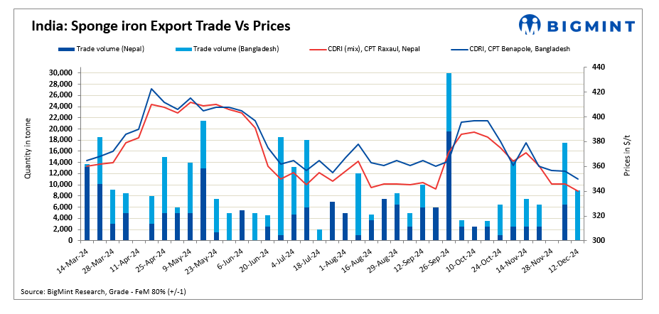 Indian sponge DRI export offers for Nepal and Bangladesh edged down this week, as buyers exhibited a cautious approach, influenced by subdued domestic steel demand.