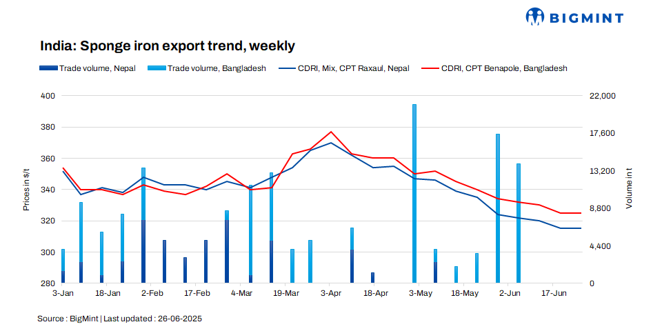 India’s sponge iron export offers to both Nepal and Bangladesh remained unchanged w-o-w, assessed at $315/t CPT Raxaul and $325/t CPT Benapole, respectively. Amid stable prices, demand remained subdued, with exporters receiving no significant inquiries. Additionally, no trade activity with neighbouring countries was observed. Market participants attributed the continued silence to economic uncertainties and unfavourable global conditions, which have pressured finished steel demand.