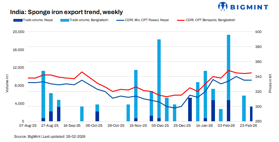 India’s sponge iron export offers remained firm w-o-w on 27 Feb’26, despite weak buying interest from Bangladesh, as per BigMint’s weekly assessment. Offers to Nepal were steady at $335/t CPT Raxaul, while Bangladesh prices edged up by $1/t to $345/t CPT Benapole. Participants reported muted enquiries from Bangladesh, while Nepal witnessed few bookings. Around 3,000 t were traded during the week, all destined for Nepal.