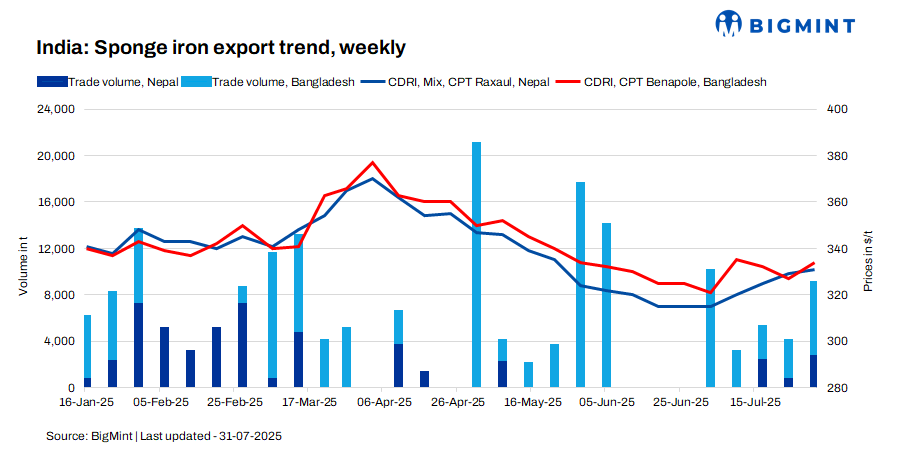 India’s sponge iron export prices increased by $2-7/t w-o-w, supported by an uptick in domestic tags and tight availability. Export offers to Nepal increased by $2/t to $331/t CPT Raxaul. Meanwhile, offers to Bangladesh rose sharply by $7/t to $334/t CPT Benapole. Moderate buying was recorded from both Nepal and Bangladesh throughout the week, with approximately 9,000 t traded at varying prices.