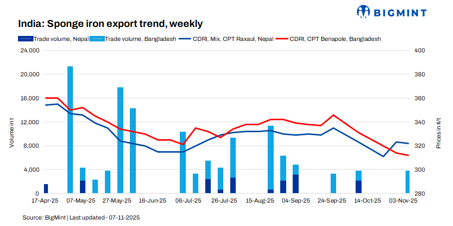 India’s sponge iron export market remained under pressure this week, following the persistent domestic downtrend. Export offers to Nepal slipped by $1/t w-o-w, assessed at $312/t CPT Raxaul, while offers to Bangladesh declined by $2/t, settling at $322/t CPT Benapole, according to BigMint’s weekly assessment. Buying activity remained limited, with deals for around 3,500 t of sponge iron concluded, destined for Bangladesh.