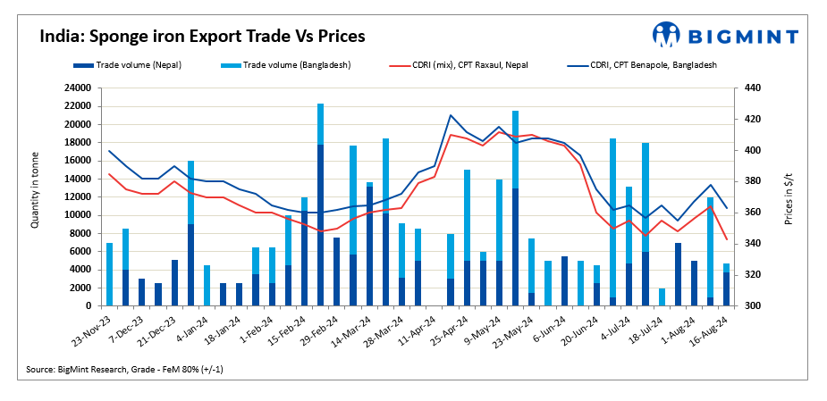BigMint’s weekly price assessment for sponge iron export offers shows significant decline of $15-21/t, reflecting limited buying demand in the global spot market w-o-w;