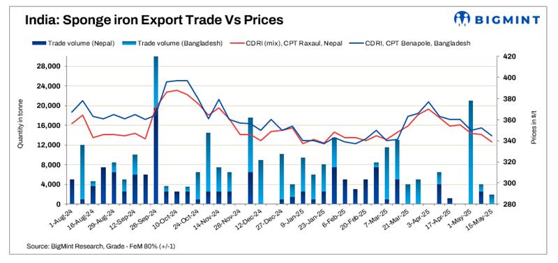 India’s sponge iron export offers to Nepal and Bangladesh dropped by $7/t w-o-w to $339/t CPT Raxaul and $345/t CPT Benapole, respectively, as per BigMint’s weekly assessment. Limited buying led to a price correction, but despite the drop, inquiries remained limited. The market saw muted trade activity, with reportedly only around 2,000 t booked for Bangladesh.
