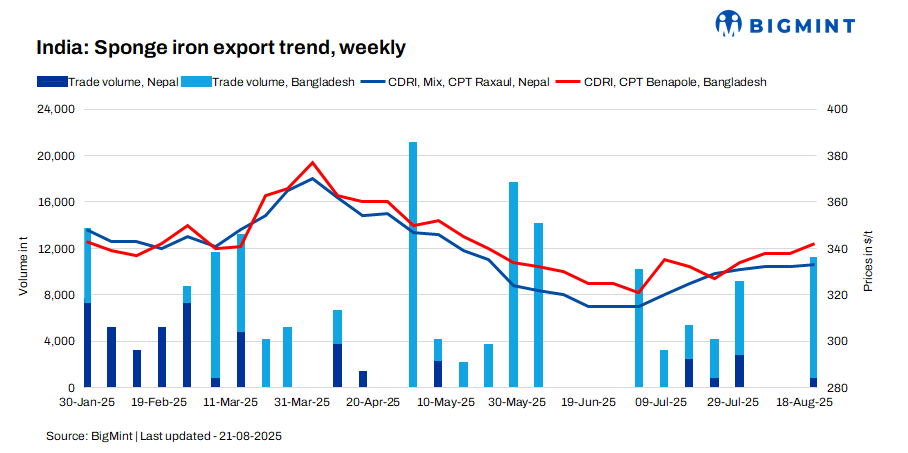 India’s sponge iron export offers edged up w-o-w, amid an uptick in bookings, particularly from Bangladesh. Around 11,000 t were traded this week.