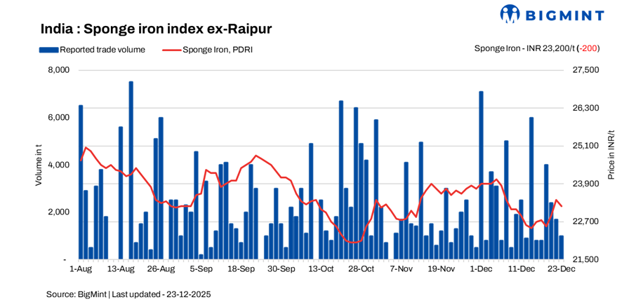 India’s sponge iron market remained volatile on 23 December, as region-specific demand variations and prevailing uncertainty continued to influence sentiment. Market participants remained cautious, following a wait-and-watch approach and restricting purchases to strictly need-based requirements amid volatile conditions.