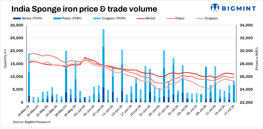 About 9,700 t of sponge iron deals were recorded today compared to 9,650 t on 16 July.