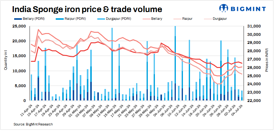 About 6,200 t of sponge iron deals were recorded today compared to 7,360 t on 3 July.