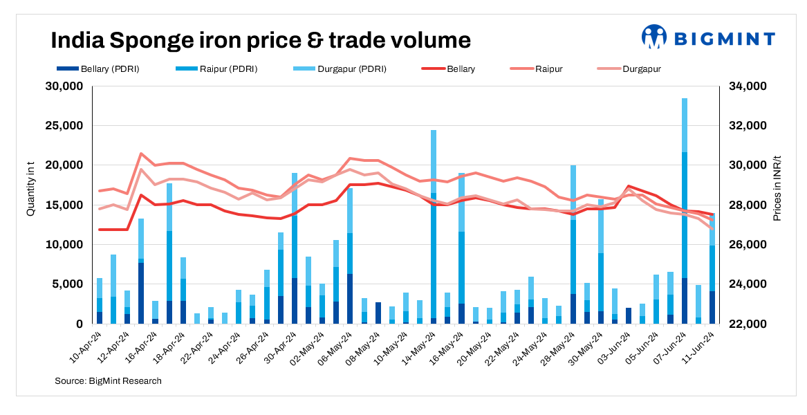 Sponge iron prices in India decreased today. Prices dropped by INR 100-800/t across regions due to selling pressure and weakened market sentiments.