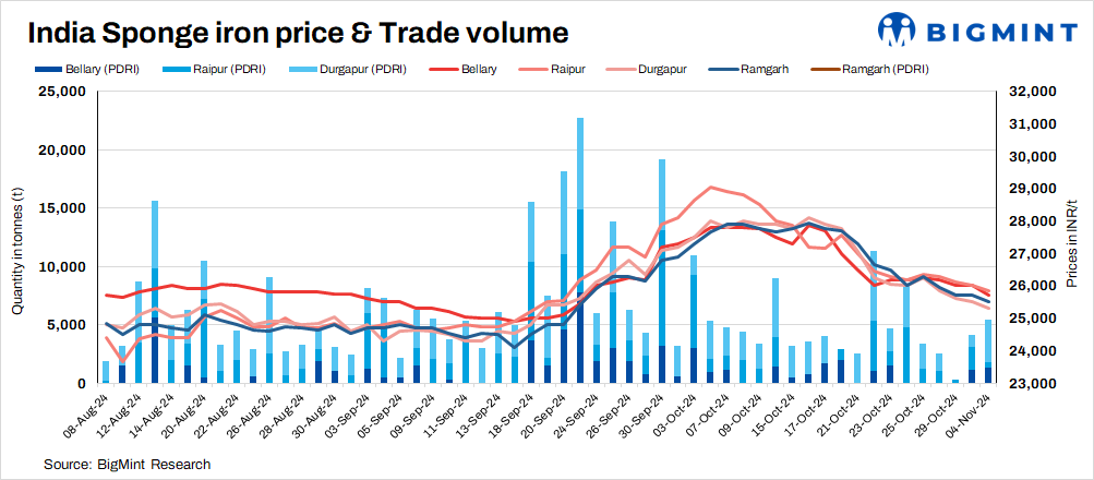 Only 10,300 t of sponge iron transactions were recorded in the country compared to 4,350 t on 30 October.
