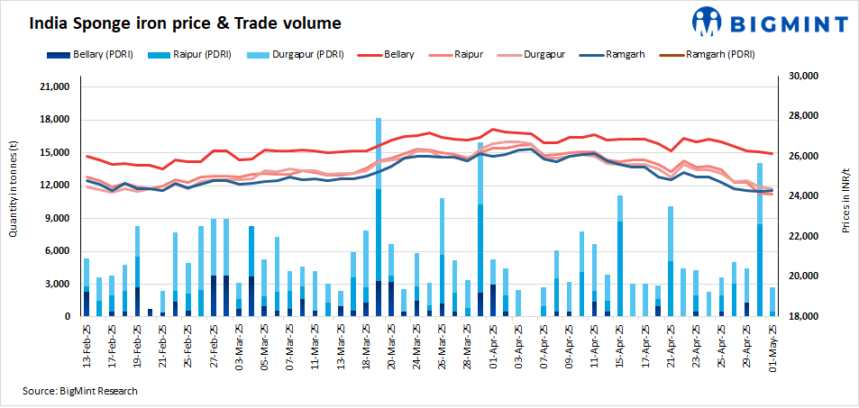 Despite a cautious market mood, total transaction volumes today remained moderate. Deals for only 5,200 t of sponge iron were recorded in the country today compared to 20,000 t on 30 April.