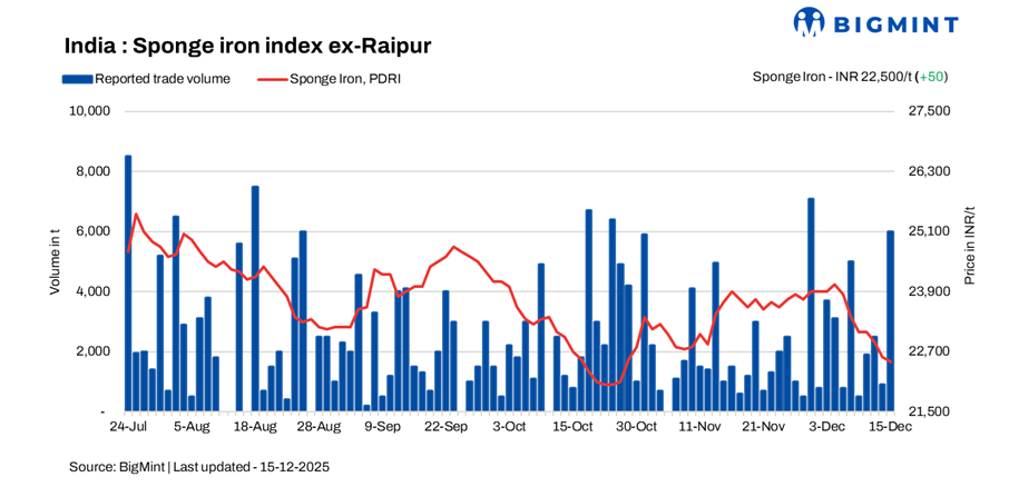 India’s sponge iron market recorded a mixed price trend on 15 December as region-specific demand conditions and ongoing uncertainty influenced prices. Market participants remained cautious, adopting a wait-and-watch approach and limiting purchases to need-based deals. Volatility persisted throughout the session as buyers hesitated to commit due to unclear market signals.