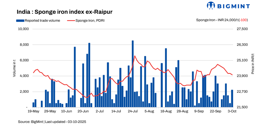 The Indian sponge iron market remained under pressure on 3rd Oct 2025, with prices declining by INR 50-100/tonne across major regions. Most transactions were limited to need-based procurement, as buyers refrained from bulk bookings amid ongoing market uncertainty.