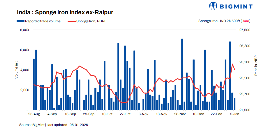 Sponge iron prices across India fell by between INR 50-750/tonne on 5 January 2026, as persistent weakness in demand and limited market enquiries kept trading subdued. The sharpest correction was observed Ramgarh and Raigarh regions, due to weak buying interest and subdued downstream activity.