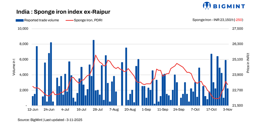 India’s sponge iron prices fell by INR 150-400/t d-o-d on 3 November 2025 across major producing regions. The decline was largely driven by muted buying interest and increased selling pressure, as traders and manufacturers adjusted offers to attract limited inquiries.