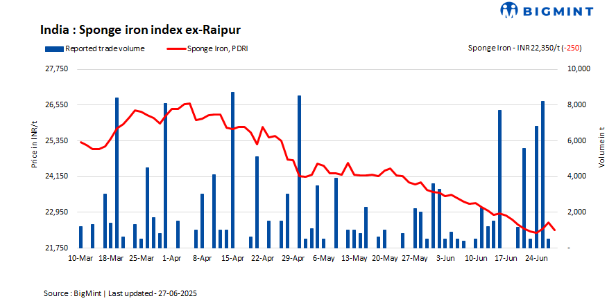 Transactions for approximately 4,650 t of sponge iron were recorded today. The overall sentiment was one of wait-and-watch, with participants reluctant to enter into new deals at current price points, expecting possible price corrections or stabilisation in the near term.
