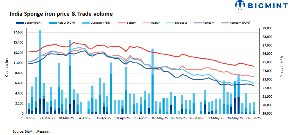 Sponge iron prices in India witnessed a steady decline today, dropping by INR 100-500/tonne (t) across locations amid selling pressure and weakening market sentiments.
