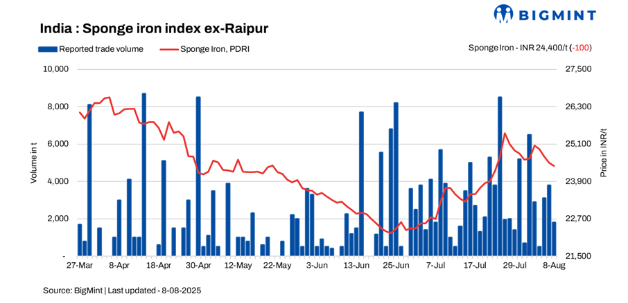 Sponge iron spot prices fell by INR 100-200/tonne across major Indian markets, with Chennai witnessing the sharpest correction. In contrast, Durgapur saw a price rise of INR 100/tonne, supported by localized demand. Prices declined in the first half of the day amid weak sentiment, but a shift emerged later as speculative buying picked up, prompting marginal recovery.