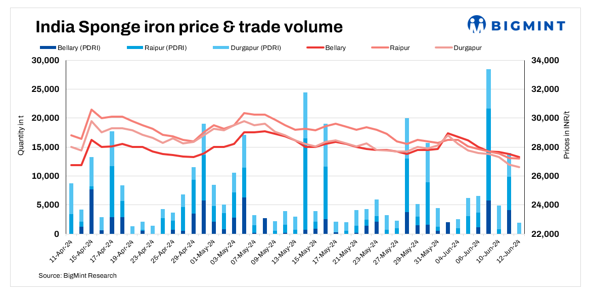 Sponge iron prices fell by INR 50-300/tonne (t) in all key locations across India on 12 June, 2024 on limited buying interest and falling steel prices.