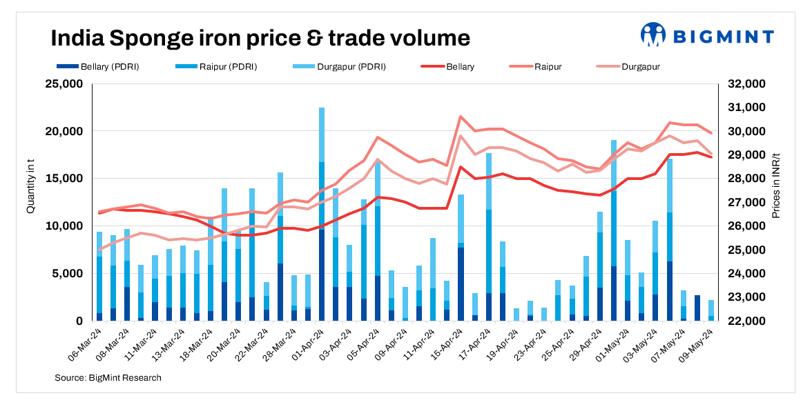 Sponge iron prices fell by INR 100-600/tonne (t) in all key locations across India on 9 May, 2024 on limited buying interest.