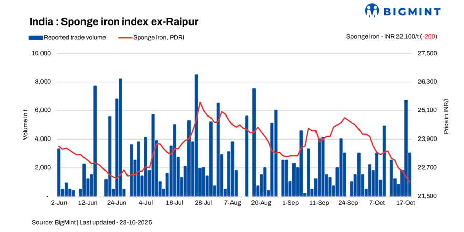 Sponge iron prices across markets witnessed a day-on-day (d-o-d) decline of INR 100-650/t on 23 October 2025, as market activity remained subdued following the extended holiday period. Limited participation from buyers kept overall trading sentiment weak, with most participants still in a holiday mood.