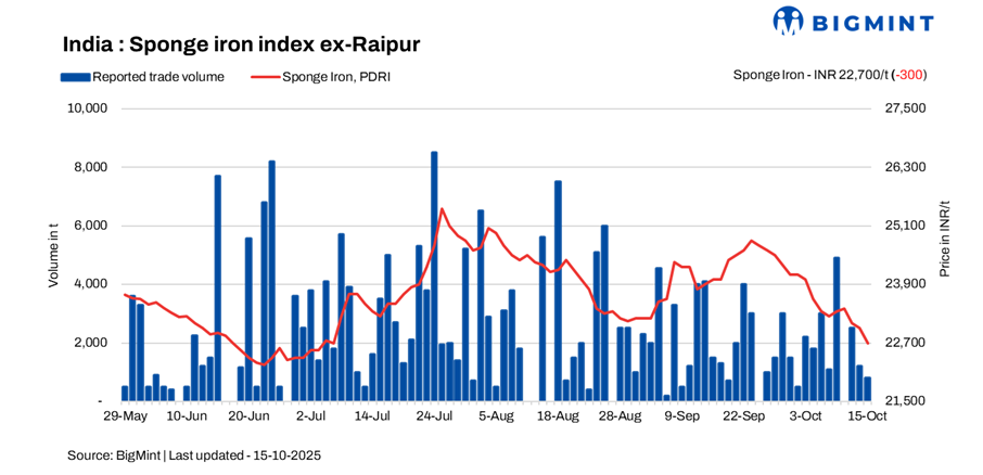 Sponge iron prices across India witnessed a decline of INR 50-400/t on 15 October 2025, as persistent weakness in demand and limited market enquiries kept trading subdued. The sharpest correction was observed in the Bellary region, where prices fell by INR 400/t, driven by thin buying interest and sluggish downstream activity.