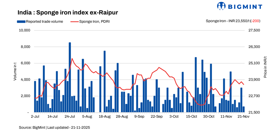 Sponge iron prices across India slipped by INR 50-200/tonne (t) d-o-d on 21 November. Market sentiment was weak amid subdued finished steel demand, which, in turn, limited sponge iron procurement. Buyers mostly maintained a wait-and-watch approach, expecting further price corrections and clarity on trends before making any sizeable bookings. Purchase activity remained largely need-based, with no significant bulk deals heard.